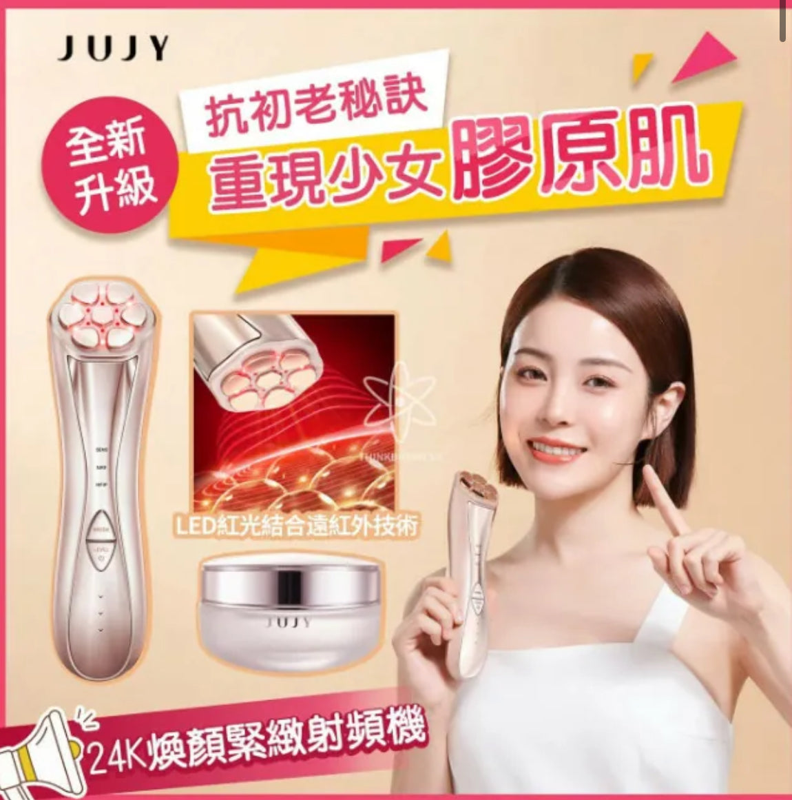 呢款JUJY 24K煥顏緊緻射頻機主打抗初老功能 可以促進膠原蛋白再生 緊緻提拉下顎線 導入功能可以令到護膚品滲透率更高