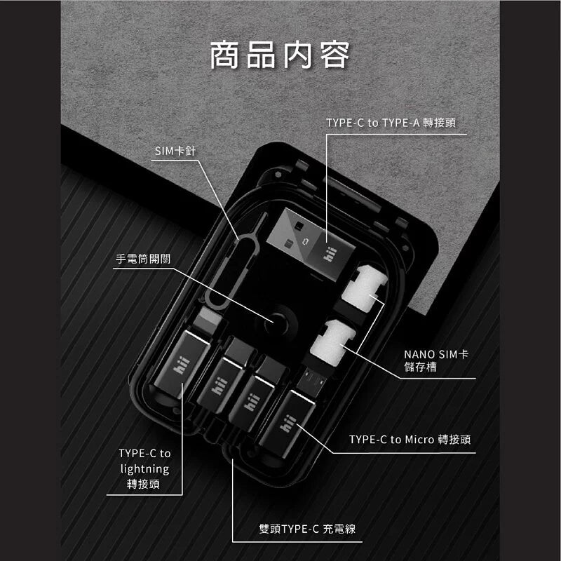 內含功能:多種類型數據線(支援PD快充)﹑卡片收納盒﹑無線充電﹑SIM工具組﹑讀卡機﹑手機支架﹑手電筒