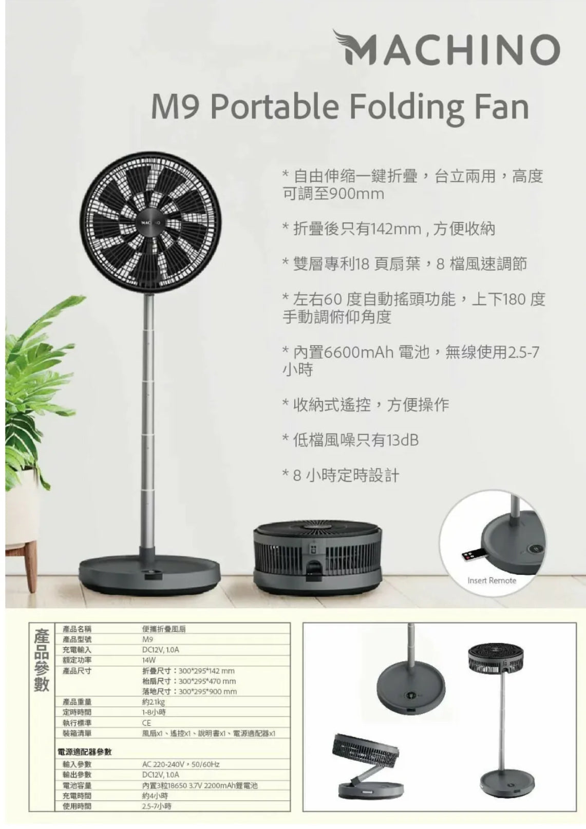 天氣開始熱了,想買多把風扇又怕屋企無位放,又想方便攜帶去沙灘及露營,Machino M9 折疊伸縮扇就最適合,自由伸縮,高度可調至900mm, 折疊後只有142mm, 方便收納,雙層專利18 頁扇葉,左右60 度搖頭功能,內置6600mAh 電池可無缐使用,收納式遙控,方便操作,還有8 小時定時,功能十足。